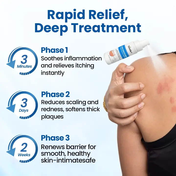 Timilk® Magnesium Repair Spray penetrates deep into the skin, gently cleansing from the inside out and quickly relieving itchiness and inflammation caused by psoriasis. This steroid-free, non-irritating formula is safe for sensitive and compromised skin, helping regulate excessive skin cell proliferation while soothing redness, flaking, and stinging to restore your skin’s natural barrier.