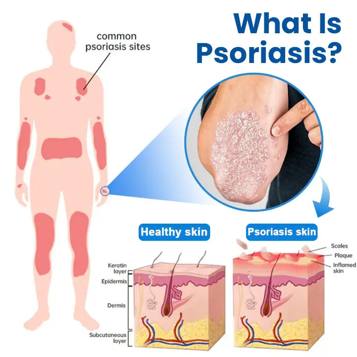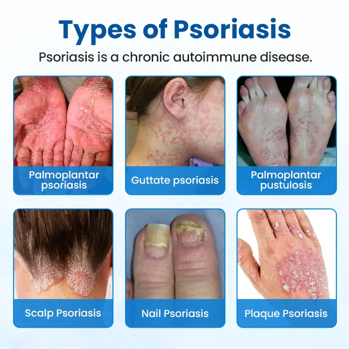 Psoriasis is a chronic autoimmune disease where the immune system mistakenly attacks normal, healthy skin cells, leading to excessive growth, accumulation, scaling, and redness. This condition can manifest in various forms throughout the body, causing blisters and sweat rash on sensitive areas, intense itching and cracked skin that bleeds easily, contact dermatitis-like reactions to everyday triggers, severe peeling on hands and feet that affects daily activities, classic psoriasis plaques with thick, scaly patches, and heat rash symptoms that worsen in warm conditions.